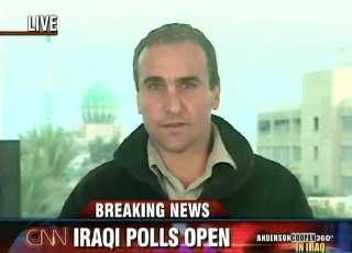 Anderson hosts from Bakuba, Michael’s in Baghdad. Although there were fewer acts of violence than was the case for earlier elections in Iraq, the polls opened while AC was on the air and explosions occurred immediately.