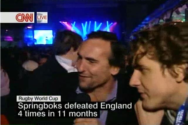 And here he is back in October in Paris during the coverage of the Rugby World Cup, stopping an over-excited fan from tackling Michael during a live shot (while never letting go of his cellphone!):