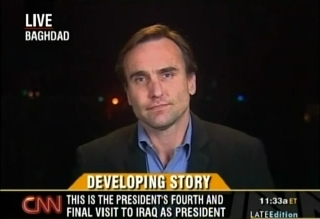 The first report is a straightforward recap of President Bush's arrival in Iraq and the expected meetings and events during his trip. Just before the end of the program, a quick report about the incident at the press conference that was about to become the shoe heard 'round the world.