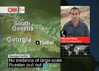 Tom Foreman asks Michael for an update. The Russian troops are now only 29 miles east of Tbilisi. They are now controlling not only the two breakaway regions, but the land between. Michael believes that they will go to the bargaining table that way, and then 'negotiate' down to only keeping the two disputed regions. Pretty damned slick.