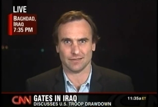 Domestic coverage of the Gates visit spanning several hours: 7pm, 8pm, and 11pm Baghdad time. In the first, Michael gives some details of the logistics of the trip, while in the second we see a brief clip of Gates addressing troops at Balad airbase. The third clip is a recorded recap.