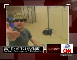 A BackStory clip from the July 4th softball game at FOB Hammer. Tommy Evans seems to be the instigator here, but gets the tables -- and cameras -- turned on him. We also finally get introduced to the third member of the team, cameraman Miguel Castro.