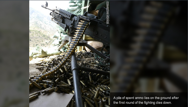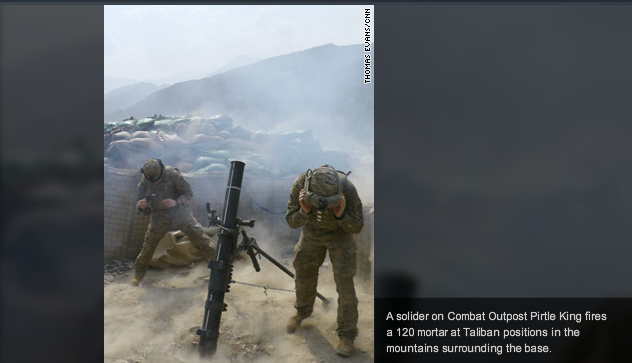 U.S. troops use mortars first on Tuesday, aiming for Taliban dug into the hills. Machine guns rattle through the air. But the incoming fire on U.S. Combat Outpost Pirtle King is very accurate. Then, four massive airstrikes, as U.S. jets strafe the hills. The Taliban falls silent.